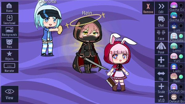 从各种各样的背景和前景中选择。用自概念文本框让你的角色相互交谈,宠物也一样。