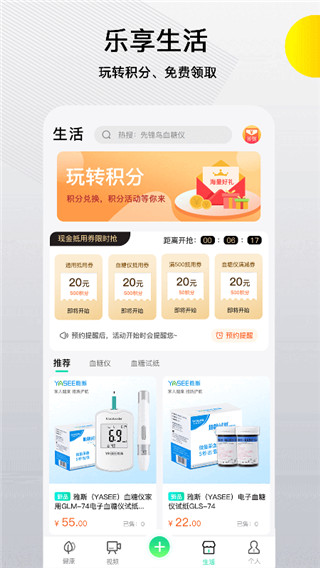 2、生活一站式服务生活模块饱含现金购物,玩好积分,0元购物等内容。积分可以免费获得并且玩法多样,90%的产品可以直接用积分直接兑换(涵盖血糖仪,血糖试纸,无糖健康食品三大类)。