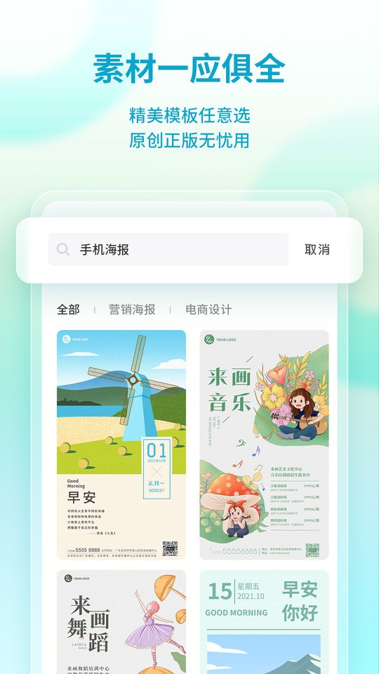 用户可自由选择海报模板风格、样式、字体及颜色等进行创意设计