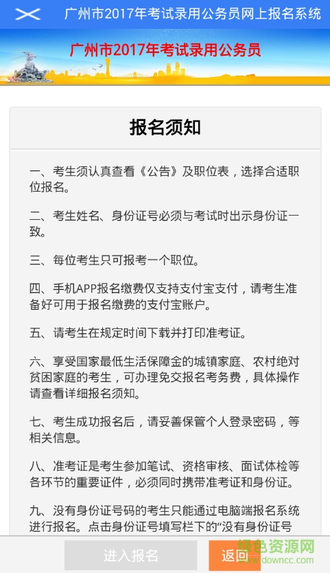 1.提交考试报名申请。考试报名职员应仔细阅读招考公告和考试报名指南,了解具体职位资格条件,确认符合条件后在绿色资源网下载“广州考录”APP,填写资料,并上传本人最近免冠2寸正面证件电子照片。