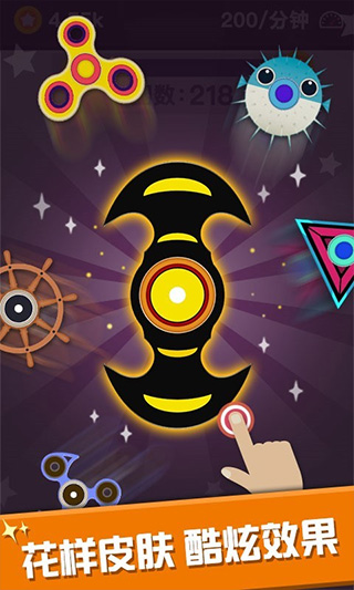 2、达成上方的圈数需要即可获得金币,点击右下角的陀螺图标可以解锁更多的指尖陀螺样式