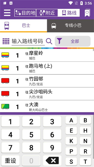 - 在主页上点击新的“目的地”按钮,系统会建议从用户目前地方到所选目的地的直达城巴新巴路线,与到近期的巴士站的预计到达时间;
