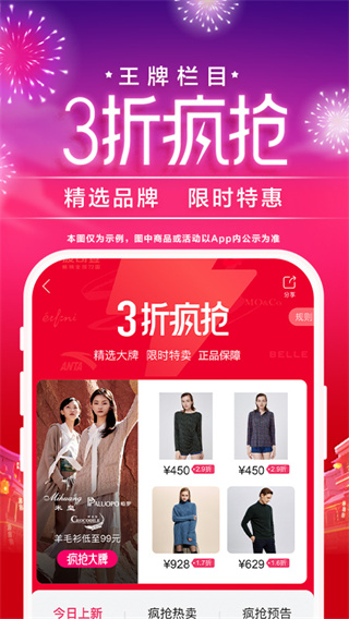 4、深度打折 限时特卖 品类齐全天天早10点晚8点上新产品。全场一线品牌深度打折,1折起售,全网最低。服装、美妆、亲子、居家多种品类,满足你的一站式购物需要。