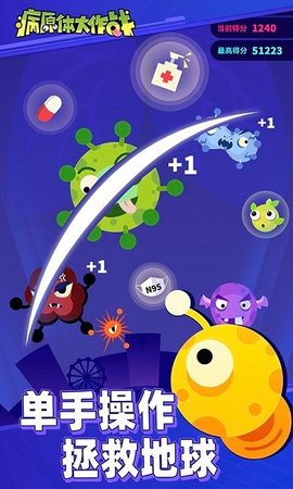 防疫大作战游戏官方正式版是一款水果忍者无玩法一样的全新休闲益智类手机游戏,在这款游戏中还普及了各种防疫的小常识,在这里面玩家可以在游戏里面通过巧妙的方法来将病毒全部都赶跑掉。通过手术刀来消灭各种病毒,过关和失败都会得到防疫提示,还能为你的城市帮助。有兴趣的玩家快来下载吧!