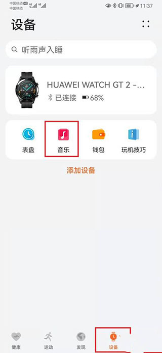 1、在华为健康应用的设施页面,打开华为手表【音乐】选项;