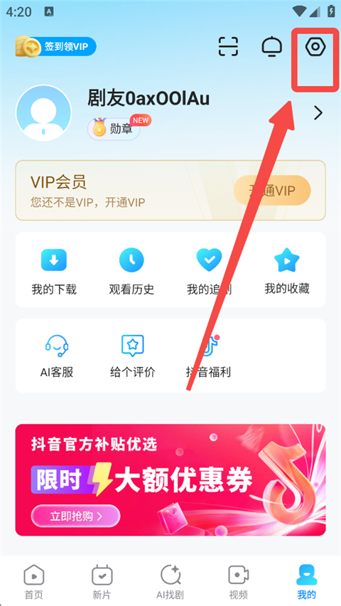 1、打开每人视频官方版App,进入【我的】页面,点击上方设置图标。