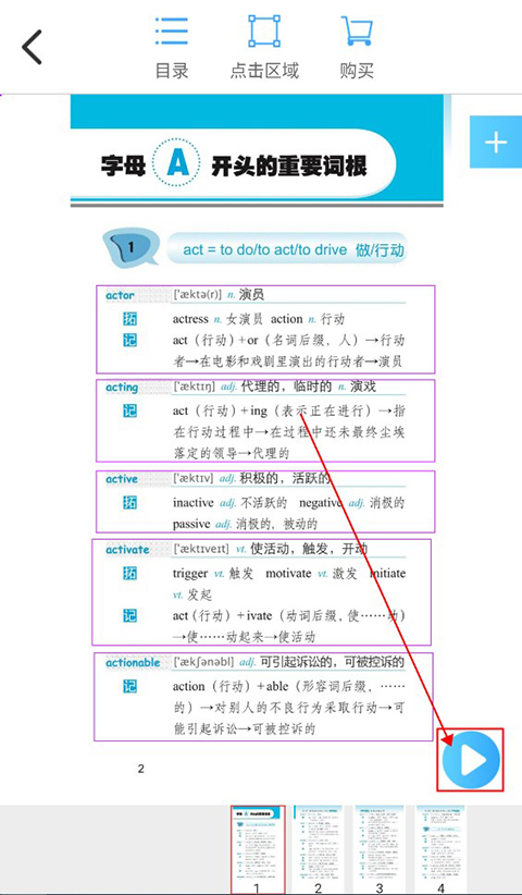 进入书本页面后,点击右下角的蓝色三角形图标就能开始点读啦,这个时候用户就能跟着一块读啦!