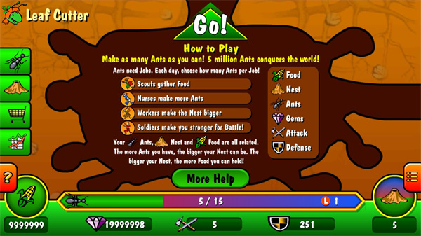 #培养#卡通#模拟#休闲蚂蚁战争模拟器最新版是一款以蚂蚁为题材的模拟培养游戏,模拟游戏大部分都是模拟超市、饭店经营之类的,但这款游戏并不同,模拟的是战争。在游戏里玩家需要管理一个小的蚂蚁农场,然后不断进步,构建一个蚂蚁帝国,在这个过程中你会遇见敌人的入侵,你需要升级练习自己蚂蚁士兵的技能击败敌人守护我们的家园,持续的扩大我们的蚂蚁巢,从而来获得更多的食物。并且在蚂蚁战争游戏中有四种不一样的蚂蚁,每一种蚂蚁的分工不同,玩家需要好好借助哦!不只这样,游戏最有趣的一个地方在于可以观看地上和地下场景,在地下场景可以扩展地盘,繁殖蚂蚁,在地上场景可以采集食物同时攻击敌人,对手速的需要还是有一点的。另外,不要看游戏体积小,但画面表现的蚂蚁和各种战斗装置还是十分明确、逼真的,游戏卡片的图片绘制也十分精美,背景音乐的步伐也很好,给人一种置身昆虫世界的感觉,整体表现得非常有特点。