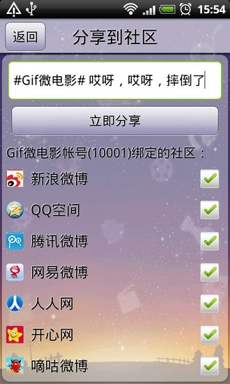 3.Gif微电影可即时将片段一键推荐到新浪微博、腾讯微博、qq空间、每人网、高兴网、嘀咕网等多个社区,且仅需一份的流量。因为自主革新的高压缩算法,gif微电影虽以小片段呈现,却不会比静态图片耗费流量。