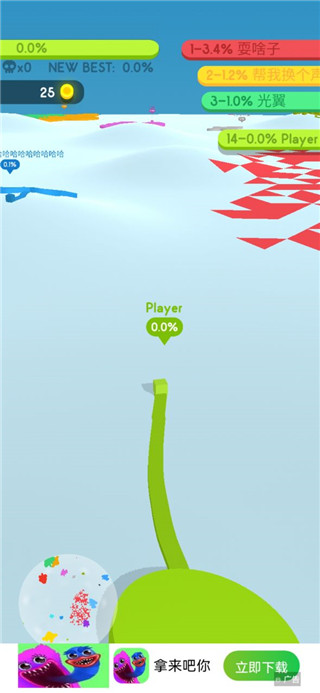 3、具备容易的操作玩法,控制好你的纸团在场地中进行绘图占领地盘,获得分数3、你会占据一块土地,当你排队你创建一个圆形矩形与你以前的土地
