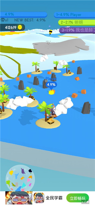 开局一据点,地盘全靠抢!本次我们为大伙带来的是圈出一块地游戏,这是一款io类的竞技手机游戏,游戏在画面上使用了3D卡通风格,游戏容易有趣,画面精致明确,玩法丰富,在这里玩家开局只有一个非常小的据点,需要通过操纵一个从据点中跑出来的小方块,持续的让方块画出跟据点一块的闭合圈圈,圈到的地就会变成我们的颜色,也就是我们的地盘安利,圈得越多,胜利就离自己越近!同时在游戏中玩家在扩张的时候应该注意不要被敌人碰到没链接完整的线,不然游戏会结束。此外,在圈出一块地游戏中还对应加入反吞并机制,可以割地吞并敌人,也会被敌人撞击摧毁移动留下的割地虚线,从而直接退出割地角逐。以割地时的移动操作解释技,以领地多寡和生死解释竞,要么竞技得胜,要么退出角逐,很残酷。计算得分时,借助反吞并机制消灭敌人的得分,甚至是割地得分的三倍有余。