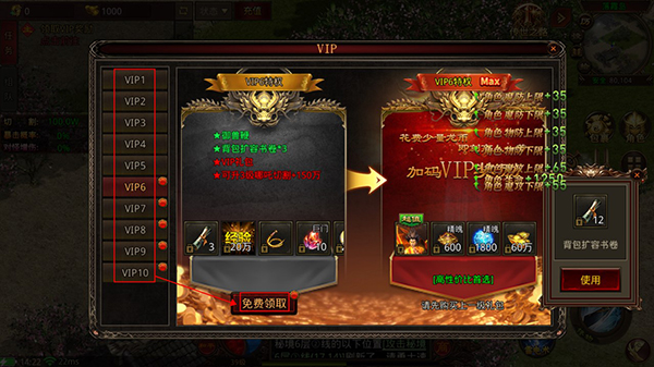 2、开始游戏前,玩家可以先领取满级VIP奖励,直线暴涨战力。