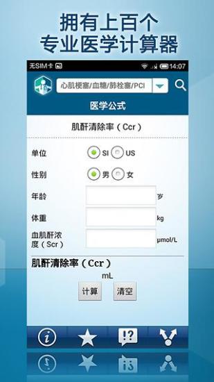 提供专业的临床计算公式, 可以辅助临床大夫进行有关计算,包含:心血管系统、内分泌代谢系统、血液系统、泌尿系统、呼吸系统、肌肉骨骼系统和外科等多个专科范围的常用公式(支持离线用)。