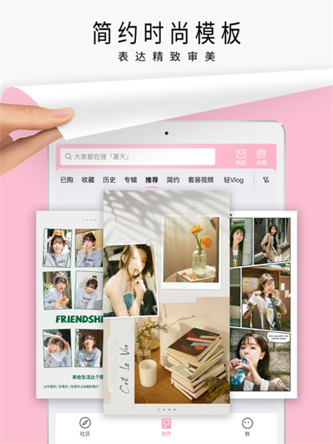 简拼ipad版是专为苹果iPad用户推出的拼图软件。这款软件提供专用模板任你选择,在简拼中评出你的夏日遐想,同时支持云端保存,保证数据不丢失。不只这样,除去模板的选取,简拼ipad版中还提供了滤镜美颜、视频编辑、文字编辑等丰富功能,滤镜风格:清爽、日系、胶片、港风、复古等各种风格滤镜,总有一款适用于你的视频表达;简而言之,假如在平时的冗杂中感觉心情有的小低落可以和Jane 简拼一块,拭去琐碎,回归璞实,然而用文静的拼图、贴心的便签设计与强大的文字编辑,去发现并推荐图片和视频的极致乐趣。