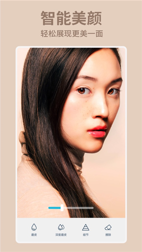 2、一键操作智能美颜,处置皮肤、细节等,都可以迅速操作,去除皮肤上的缺陷