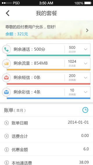 3、我的套餐中,合并余量信息与账单信息为一个页面