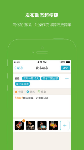 2.言传出色的商品体验,可以让老师秒发班级公告和作业,即使复杂的内容,也可以通过一键拍照发布完整公告 。