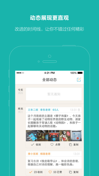 父母的种种担忧,大家为你分忧:改进的动态时间线,像浏览朋友圈一样,查询孩子的实时班级动态.
