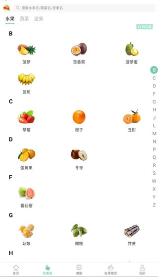 1、多达200个类型的容易见到果蔬:87种水果+98种蔬菜+15种坚果,支持迅速查找。