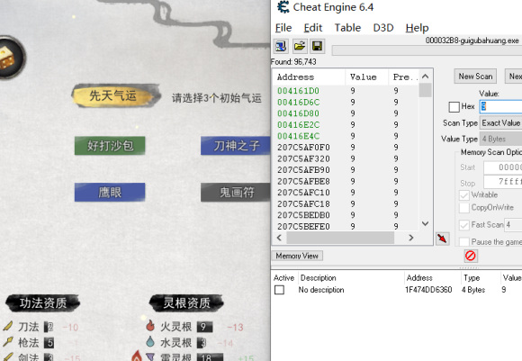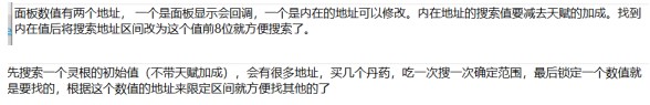 最后掷到2,大家就能找到要找的地址了,这个时候会有两个地址出现,一个是面板值,一个就是我说的初始值,大家找到初始值进行修改,大家通过选择天分改变面板数值就能找到初始值了