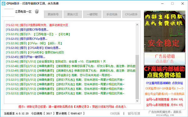 CFGA助手是由大神“ZZ微笑”着塑造的一款穿越火线最新活动一键领道具工具,它可以帮助cf玩家提供一键领活动道具、活动列表、战绩查看、CDK兑换等功能。CF玩家都了解,这款游戏拥有很多的签到奖励和各种道具奖励,但假如大家手工领取的话一天N个奖励实在是有点麻烦,有了这款CFGA助手之后就可以一键领取活动奖励,若是有任务需要的活动将自动跳过,叫你很好过任何一个可以领取的活动奖励,除去这类以外还可以自动签到,叫你一键即可一劳永逸,你还在等什么?快点来3322下载领取及道具吧!