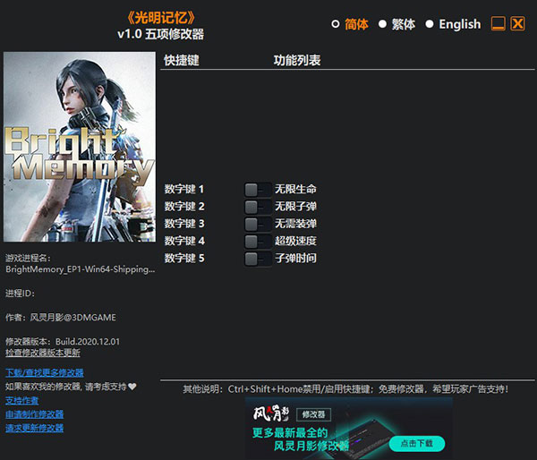 光明记忆修改器风灵月影版是由风灵月影针对同名游戏所推出的一个游戏辅助工具,通过它可以轻松的帮忙玩家增强游戏体验,提供了无限生命、无限子弹、不需要装弹、超级速度、子弹时间等五项强大的游戏修改功能,不论是玩家在战斗射击中角色子弹匮乏,还是太过容易死亡,有了这款修改器的帮忙,都可以让玩家享受机制的游戏乐趣。不只这样,修改器中支持简体、繁体、英文等多种语言设置,界面简单清爽,用也极其容易,玩家仅需进入游戏后打开修改器,依据自己的需要设置所需的按键即可,从而愈加轻松的完成游戏中的各种任务剧情,享受紧张刺激的射击挑战,有兴趣的小伙伴快来下载吧。