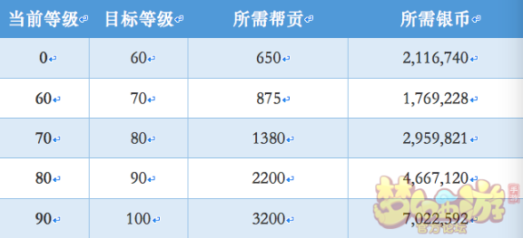与其它技能一样,最高只能学到人物等级+10级的等级。下面分段把升级所需要的帮贡、银币为大伙罗列出来,以便于大伙做一个参考囤一些银币和帮贡。
