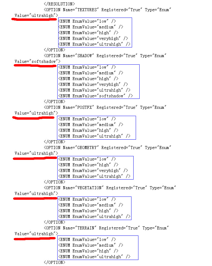 红色下划线等号后设置成效等级,蓝色框内是可以用来设置的每个等级由低到高,依据自己机器的实质状况选择,譬如把蓝色框内的high复制粘帖到红色下划线等号后面双引号内覆盖原来的设置。