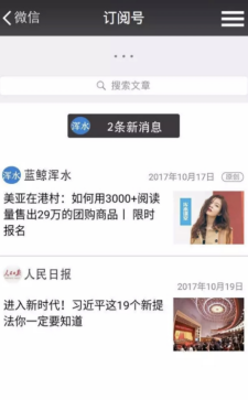 微信订阅号目前的界面是折叠式的,从订阅号到内容至少要素击3次,点开后呈现的是一个一个的公众号,有未读信息会有数字和小红点提示,再点击后才是公众号的消息页面,再点击才是具体内容。