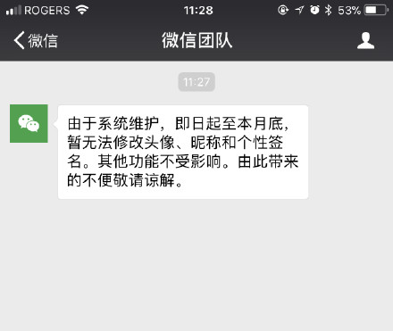 最近微信微博QQ等,将进行系统维护,即日起至本月底,用户暂时没办法修改头像、昵称和个性签名。其他功能不受影响。由此带来的不便,请广大用户谅解。