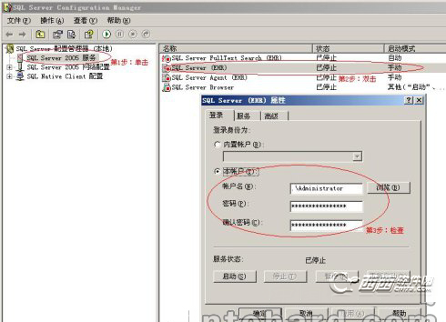 将本帐户的密码修改为你更改之后的管理员密码,“确定”即可。这个时候SQL Server服务应该就能正常启动了。