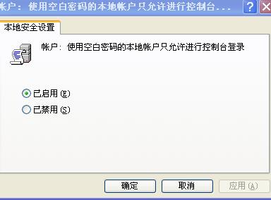 点击“开始→运行”并输入“gpedit.msc”,打开组方案。依次点击“计算机配置→Windows设置→安全设置→当地方案→安全选项”,找到“账户:用空白密码的当地用户只允许进行控制台登录”。当启用时,就不可以在远程用空密码访问,禁用它就能了。