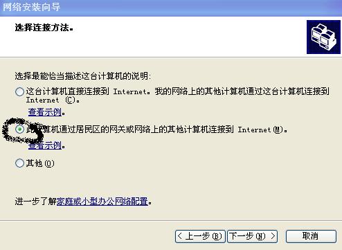 在选择连接办法选择从通过居民区连接到INTERNET点下一步
