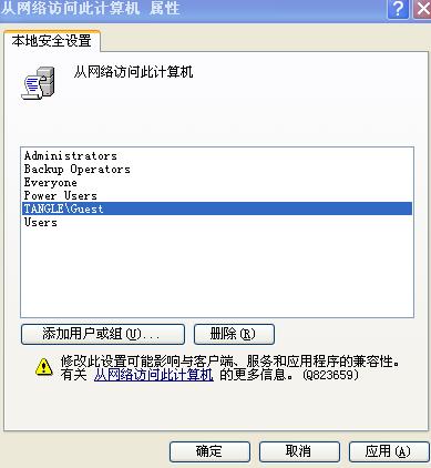 2)仍在上述组方案中,在“从互联网访问此计算机”项上双击,看有无Guest,如无,请添加。