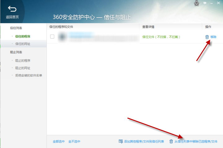 7、假如想取消信赖,点击信赖文件后面的移除。假如想一次取消多个信赖,可以勾选前面的放开,点击右下角的从信赖列表中移除已选程序/文件