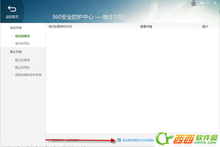 360安全卫士11.3.6官方正式版种类:360工具大小:63M语言:中文 评分:9.9标签:立即下载相信不少人都用360安全卫士对我们的电脑进行安全防护,360安全卫士会自动拦截木马程序,不过有时大家并无需拦截时,360安全卫士也会一直提示木马程序,这个时候你就需要把你要安装的软件添加成信赖文件,下面记者就教大伙360安全卫士添加/阻止信赖办法。