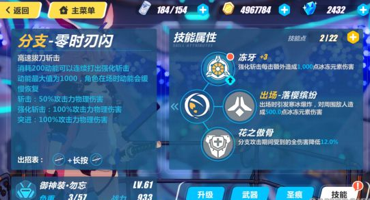 分支|零时刃闪:高速拔刀斩击,消耗200动能可以连续打出强化斩击。动能最大值为1000,角色在场时动能会缓慢恢复