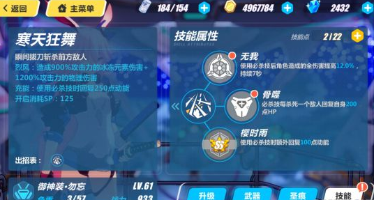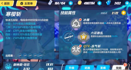寒樱斩:迅速五段斩,每段命中时回复40点动能