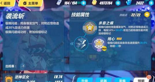 袭流斩:极限闪避,周身爆发剑气,对附近怪物导致30%攻击力伤害。极限闪避成功时,附加绯樱标记。
