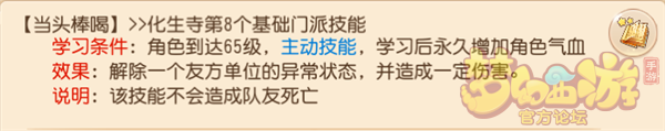 当头棒喝技能剖析:依据等级的不同,该技能大约会导致1000|1600的伤害;而且该技能不会致死,最低会保留1点气血。
