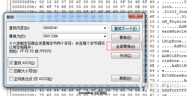 按CTRL+R键打开替换窗口,查找00008341替换为00013386查找ASCII打钩,点击全部替换