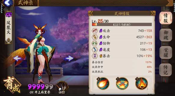 凤凰火整体来讲,更像是个控制式神,为了触发被动,需要让敌人遭到减益状况,故而需要一个高速度式神先起手。总的来讲并非特别实用。但对于眩晕硬控不能解这一点,还是非常受用的。