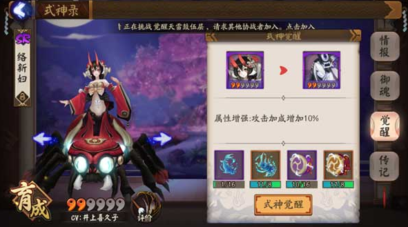 高速加攻加成效抵抗,加快我方行动条,不过缺点也非常明显,2技能要到3级才奇效,而由于是SR式神入手难,技能时常升不满。