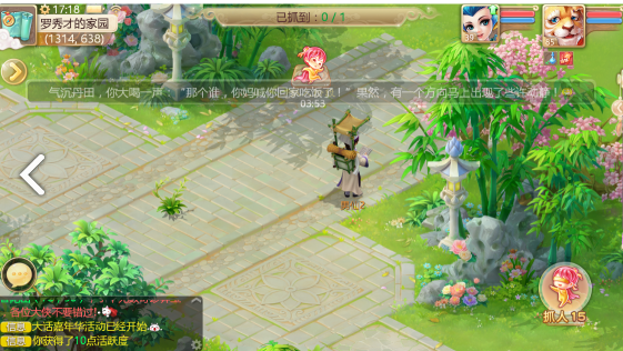 4.结束后,找人玩家才能到院子里面找人,找人时间为4分钟。当找人玩家附近出现躲藏玩家时会收到提示,此时玩家可以参考信息提示做出判断,走到相应的坐标点,用右下角【捉人】按钮,点击屏幕任意一处,找到躲藏玩家。
