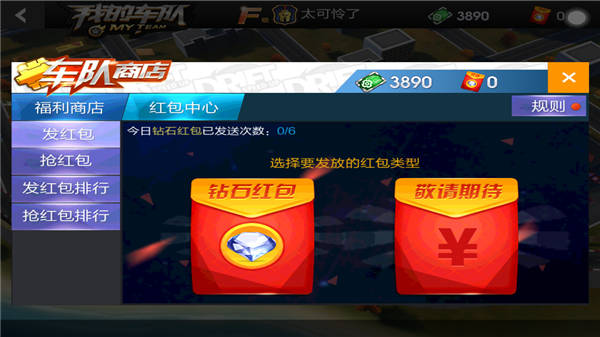 还有一种同样比较简单的方法就是发红包,在车队商城的功能中有红包中心的栏目,玩家点击进入就能获得红包。当然,红包并非花费钻石购入的,而是充值钻石时系统所赠送的。有了红包之后,玩家就能给队友发红包了,这也是有车队券奖励的。