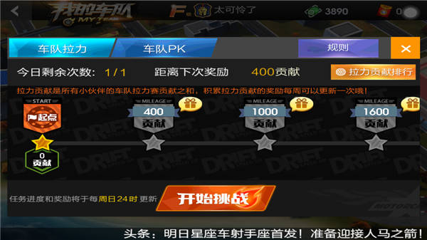 除去车队点赞以外,车队的玩家也可前往任务大厅领取每天任务,此类任务分为车队拉力赛和车队PK赛两种,前者天天只能参与一次,可获得的贡献值根据5000里程/点计算,后者则是根据排名赠送贡献值。所获贡献值越多,在结算的时候可获得的车队券奖励也就越多。所以,想要多多积攒车队券的童鞋可千万不要偷懒了,勤能致富说的一点都没错。