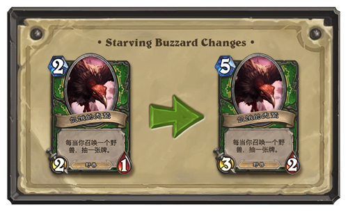 饥饿的秃鹫(猎人)目前的法力值消耗改为5点(从2点上调),具备3点攻击力和2点生命值(从2点攻击力和1点生命值上调)。