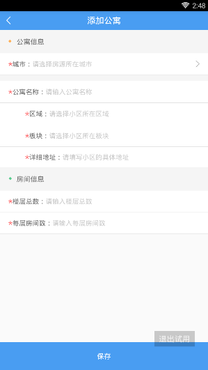 3、进入添加公寓界面,根据如实状况填写,带星号的是必填的,填完后保存就能了,如下图: