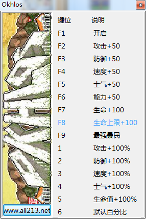 okhlos修改器是针对同名pc游戏玩家提供的一款辅助工具,用该辅助可以修改游戏的某一程序及某一程序文件,达到攻击+50、速度+50、士气+50等十四个功能,操作简单功能强大,需要的朋友欢迎来绿色资源网下载!