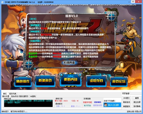 机甲小子2测试版修改器是专为热点游戏《机甲小子2测试版》塑造的辅助工具。由于《机甲小子2》现在处于测试阶段,正式版还的一段时间出来。所以玩家目前所玩的都是测试版的。而这里,绿色资源网记者给大伙带来的也是测试版的修改器,其功能非常强大,可以帮玩家强化装备、激活附魔、激活机甲等,提供玩家的战斗力,打怪刷钱更轻松。赶快下载体验吧!